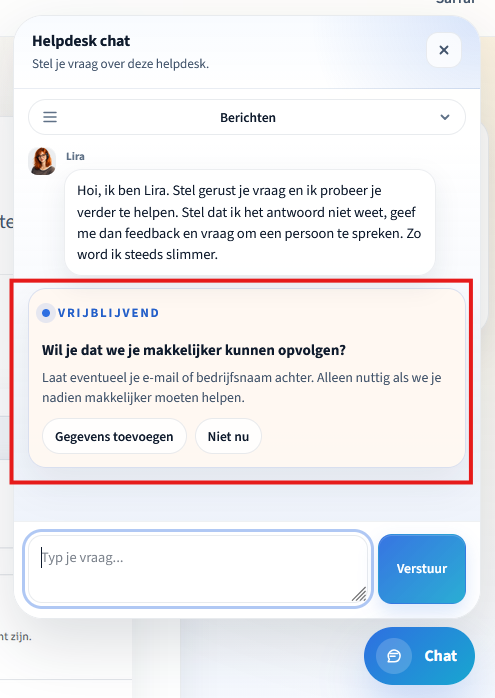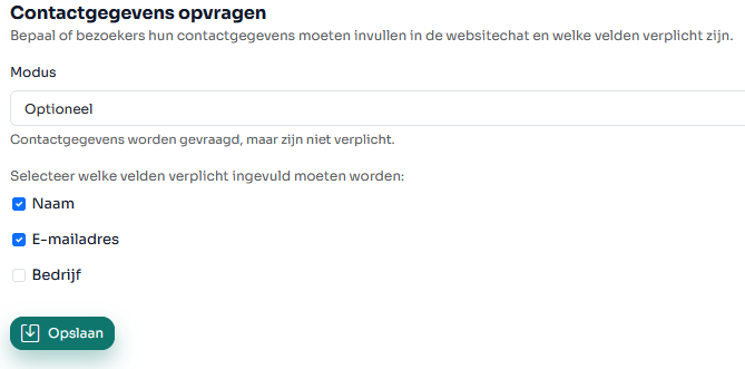 Tip: Als klanten hun gegevens invullen, worden ze automatisch als contactpersoon aangemaakt in je CRM en worden gesprekken aan hen gekoppeld. Dit maakt rapportage en opvolging een stuk eenvoudiger.