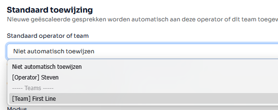 Aan een team: Alle operators die lid zijn van dat team zien het gesprek in hun team-inbox. Dit is de aanbevolen aanpak als meerdere mensen support verlenen. Maak bijvoorbeeld een team "First Line Support" aan en wijs nieuwe gesprekken toe aan dat team.