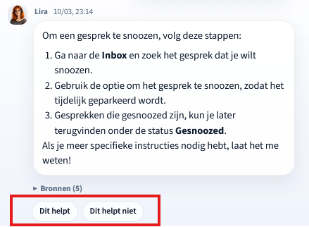 - 👍 Dit helpt: Het antwoord was nuttig. Lira gaat verder met het gesprek.